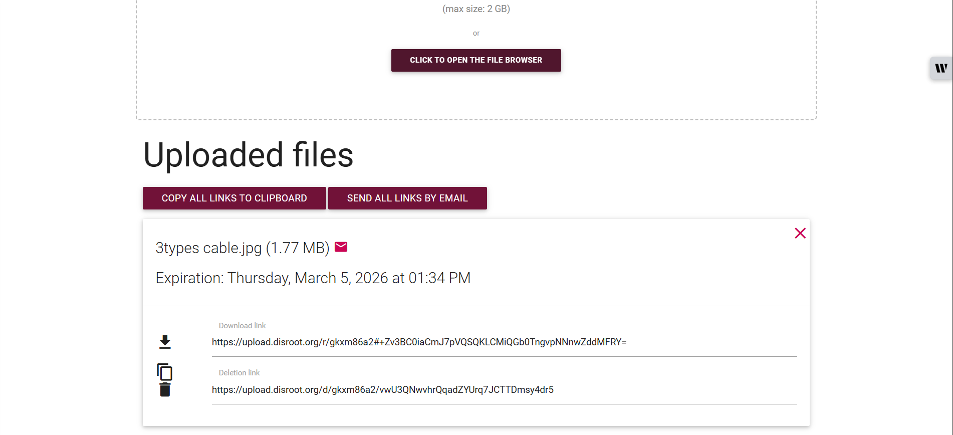 ৪। আপলোডকৃত ফাইলটি কখন অটো মুছে যাবে তার বর্ণনা, ডাউনলোড লিঙ্ক ও ডিলেটেশন লিঙ্ক দেওয়া থাকে। এই লিঙ্কটি আপনার মেইল দিয়ে আরেকজনকে পাঠাতেও পারবেন অথবা ক্লিপবোর্ডে কপি করতে পারবেন।