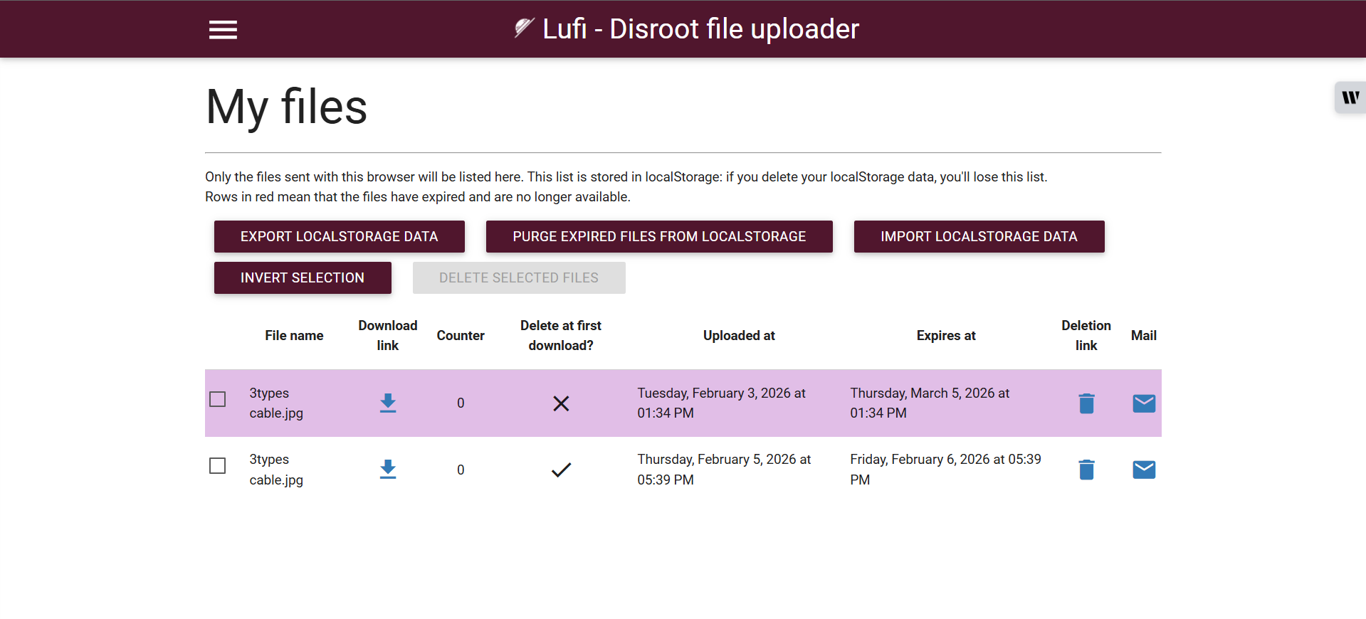 ৯। মাই ফাইল অপশনে আপনার ফাইলগুলোর নাম, ফাইল টাইপ, ফাইল সাইজ, আপলোড করার সময় ও কখন এক্সপায়ার হবে সেই সময়, এবং ডাউনলোড লিঙ্ক ও ডিলেটেশন লিঙ্ক উল্লেখিত থাকে। সঙ্গে মেইলের অপশনও রয়েছে।