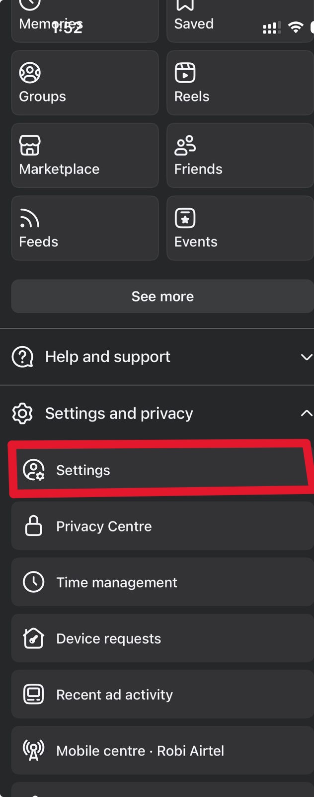 ১। ফেসবুক অ্যাকাউন্টের ‘Settings & Privacy’ অপশনটিতে গিয়ে ‘Settings’ এ ক্লিক করুন।