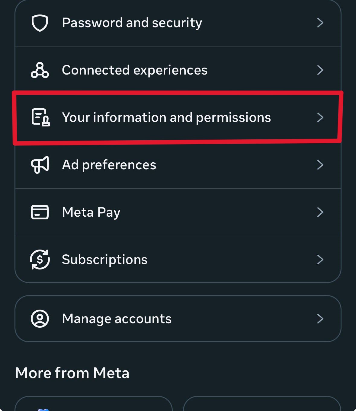 ৩। তারপর ফেসবুক আপনাকে অ্যাকাউন্ট সেন্টারে নিয়ে যাবে। সেখানে আপনি ‘Account settings’ এ গিয়ে ‘Your information and permissions’ অপশনে ক্লিক করুন।