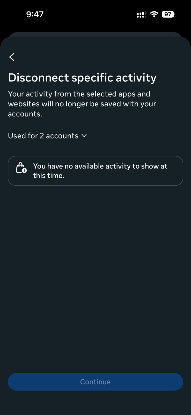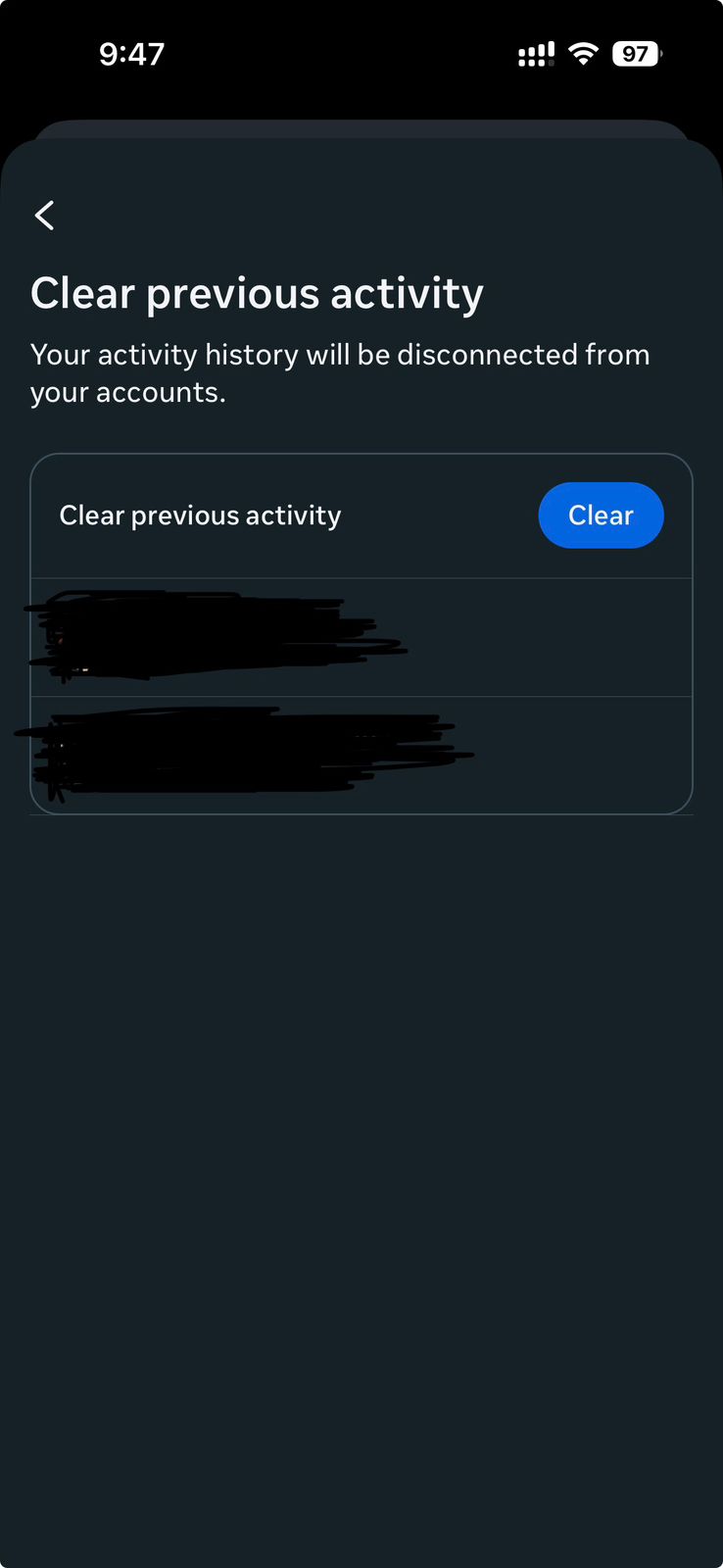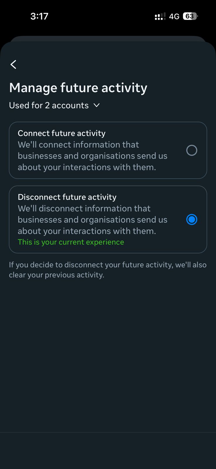 • Manage future activity: পরবর্তীতে আপনার ওয়েবসাইট অ্যাক্টিভিটি বিভিন্ন সাইট থেকে ফেসবুকে সংরক্ষণ হবে কি না তা নিয়ন্ত্রণ করবে। আপনি যদি এটি নির্বাচন করেন তাহলে ভবিষ্যতে মেটা প্ল্যাটফর্মের বাইরে আপনার কোনো ওয়েবসাইটের বা অ্যাপের অ্যাক্টিভিটি মেটা অনুসরণ করতে পারবে না।