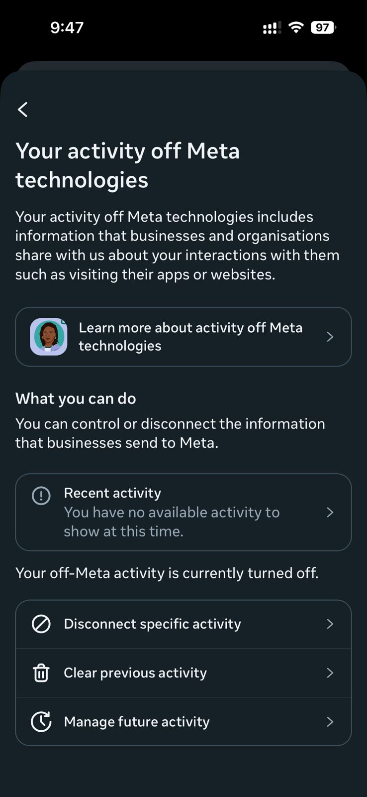 ৬। এই অপশনগুলোর মাধ্যমে আপনি আপনার অফ-মেটা অ্যাক্টিভিটি নিয়ন্ত্রণ করতে পারবেন। এখানে এই অপশনগুলোর কাজ হচ্ছে –