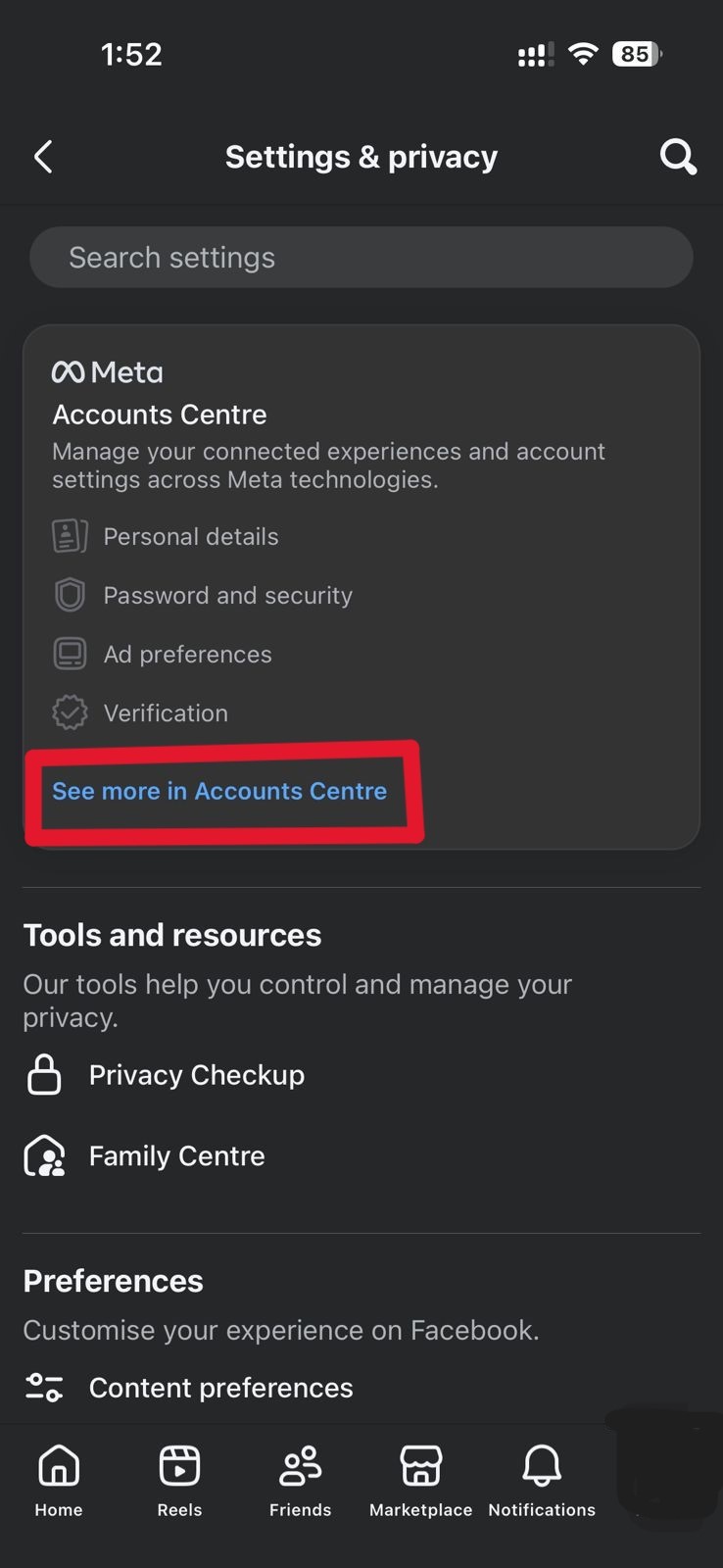 ২। এখানে আপনি ‘Accounts centre’ অপশনে গিয়ে, এরপর ‘See more in accounts centre’ এ ক্লিক করুন।